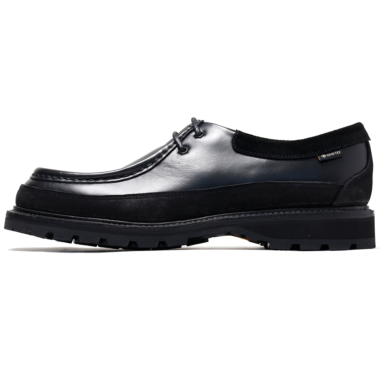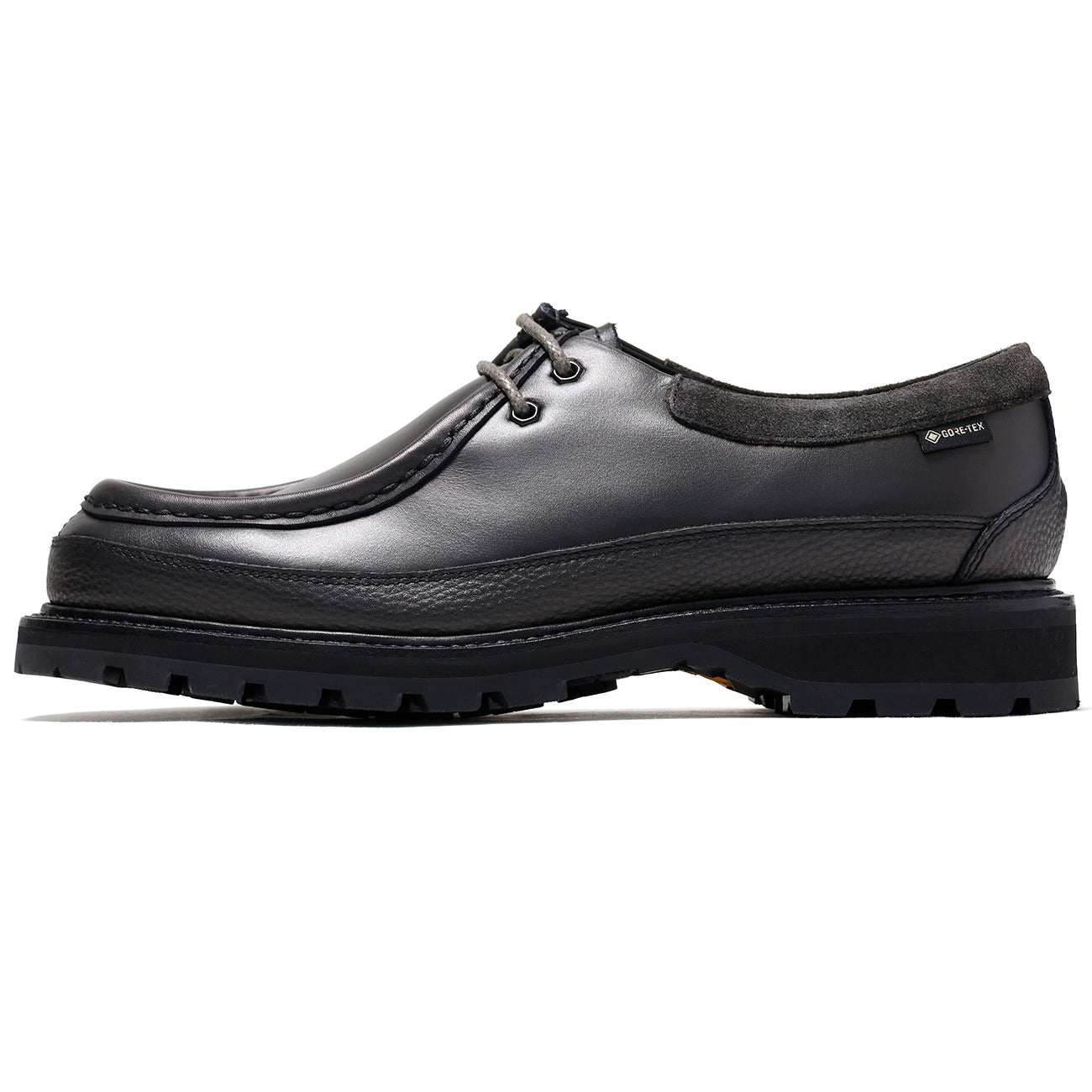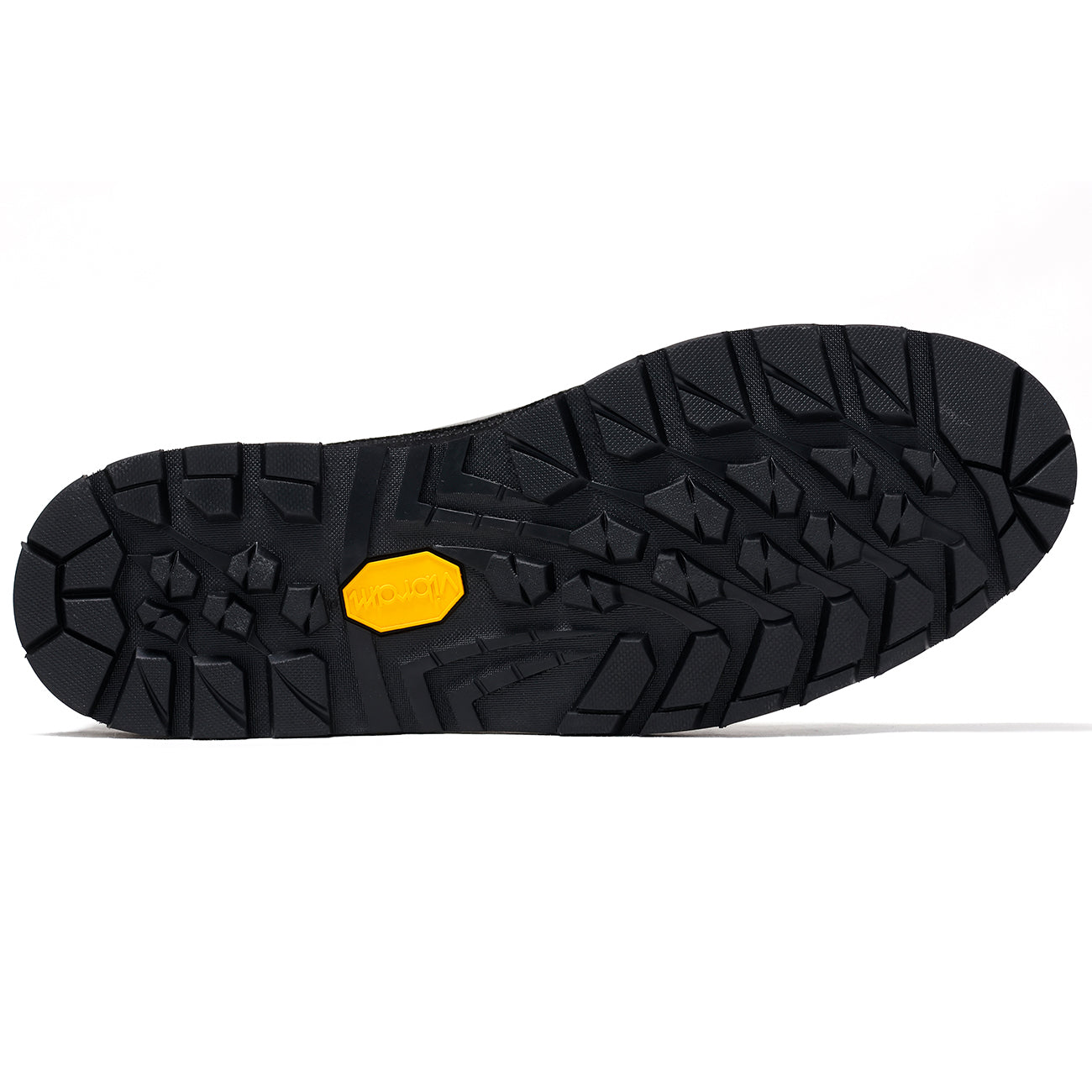 アッパーには、スムース、シュリンク、スエードといった異なる表情をもつカウハイドレザーを組み合わせ、GORE-TEX®基準を満たす全天候型仕様に。足元を支えるのは、優れたグリップ力と耐久性を誇るVibram® Mega Gripソール。